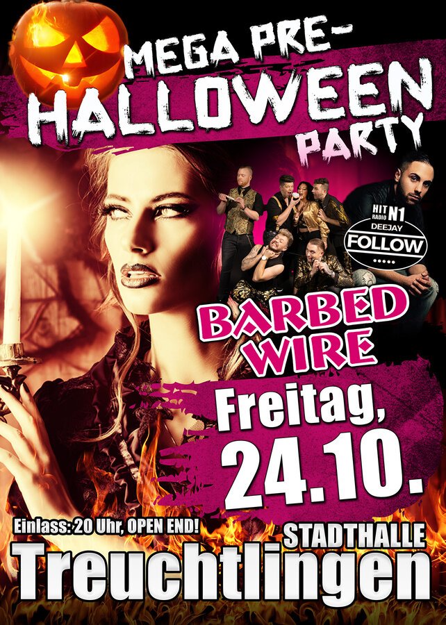 Bereits am Freitag, 24. Oktober, steigt sie wieder, die ultimative MEGA-Party mit der Liveband BARBED WIRE und Hit Radio N1 DJ Follow in der Stadthalle Treuchtlingen. Um 20:00 Uhr öffnen die knarrenden Türen und ab 21:00 Uhr beginnt die größte und schaurigste Pre-Halloween Party Mittelfrankens. Eine finstere Armada aus Monstern, Hexen, Dämonen, Vampiren und anderen Kreaturen der Nacht werden hier bis zum Abwinken feiern.